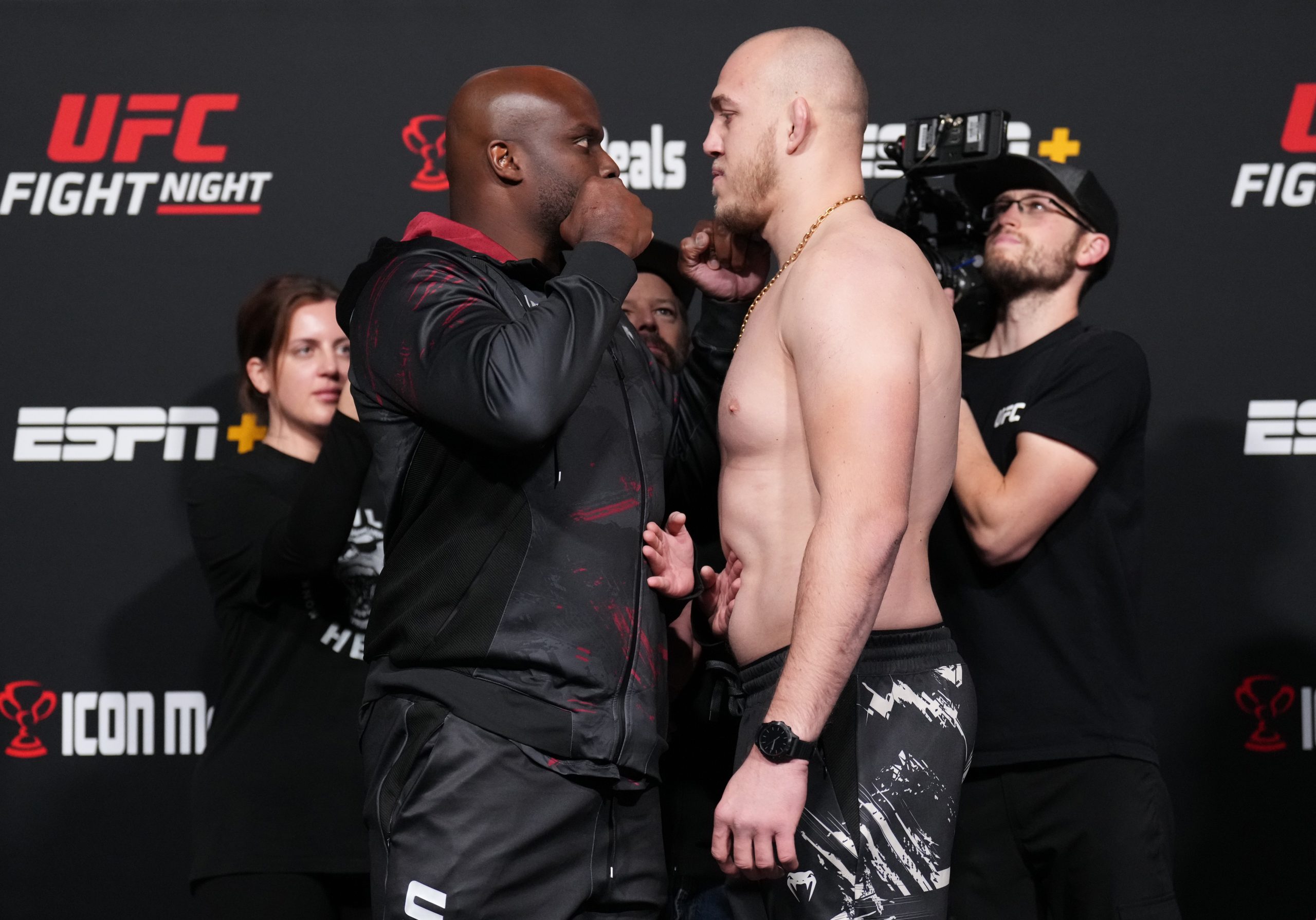 LAS VEGAS, NEVADA – NOVEMBER 18: (L-R) Opponents Derrick Lewis and Serghei Spivac of Moldova face off during the UFC Fight Night weigh-in at UFC APEX on November 18, 2022 in Las Vegas, Nevada. (Photo by Chris Unger/Zuffa LLC)
